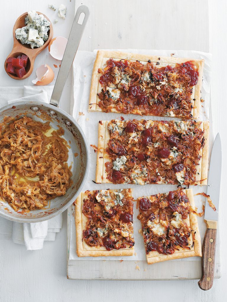 Για ορεκτικό προτείνουμε, τάρτες με καραμελωμένο κρεμμύδι, παστοκύδωνο και μπλε τυρί