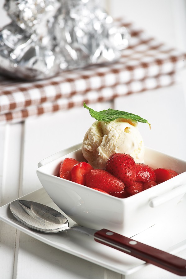 Για επιδόρπιο, φράουλες μαριναρισμένες σε λικέρ πορτοκαλιού και σερβιρισμένες με παγωτό.