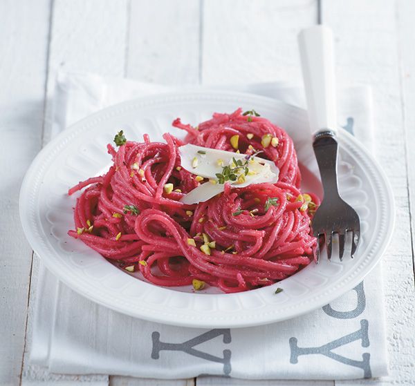 Μία εντυπωσιακή αλλά ταυτόχρονα εύκολη στην παρασκευή της μακαρονάδα, φτιάχνουμε σήμερα ή αλλιώς σπαγγέτι με pesto παντζαριού και φιστίκι Αιγίνης.