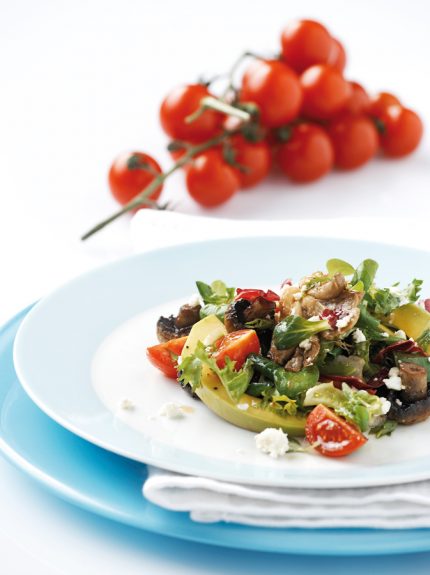 Ανάμεικτη σαλάτα με μανιτάρια, αβοκάντο και κατσικίσιο τυρί. Μια πολύ γευστική σαλάτα, που συνδυάζει αρμονικά τις φρέσκες πρασινάδες και το αβοκάντο, με τα ψητά λαχανικά. Μην παραλείψετε το κατσικίσιο τυρί, της πάει πολύ.