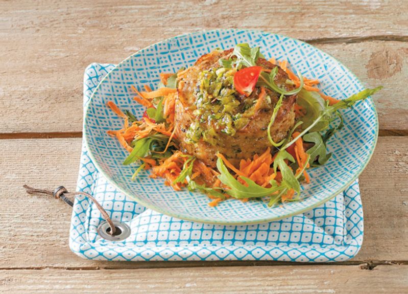 Πικάντικο μπιφτέκι από κοτόπουλο ψημένο στη λαδόκολλα και σερβιρισμένο με δροσερή σαλάτα, έχει το μενού της Τρίτης.