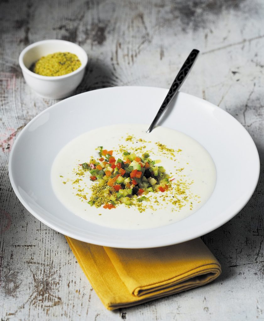Ανοίγουμε το τραπέζι με γιαουρτόσουπα με ψιλοκομμένα λαχανικά. Είναι μία σούπα ηρεμιστική και νόστιμη, που σε προετοιμάζει για ένα καλό γεύμα.