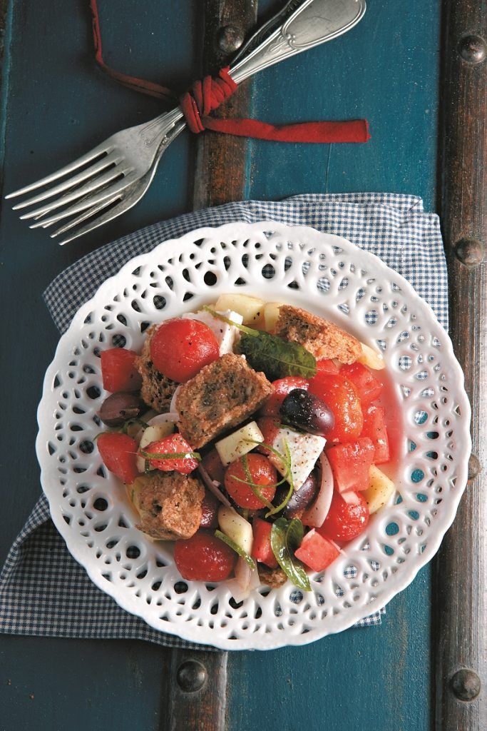 Θα τις σερβίρουμε με καλοκαιρινή σαλάτα με καρπούζι και παξιμάδια χαρουπάλευρου.