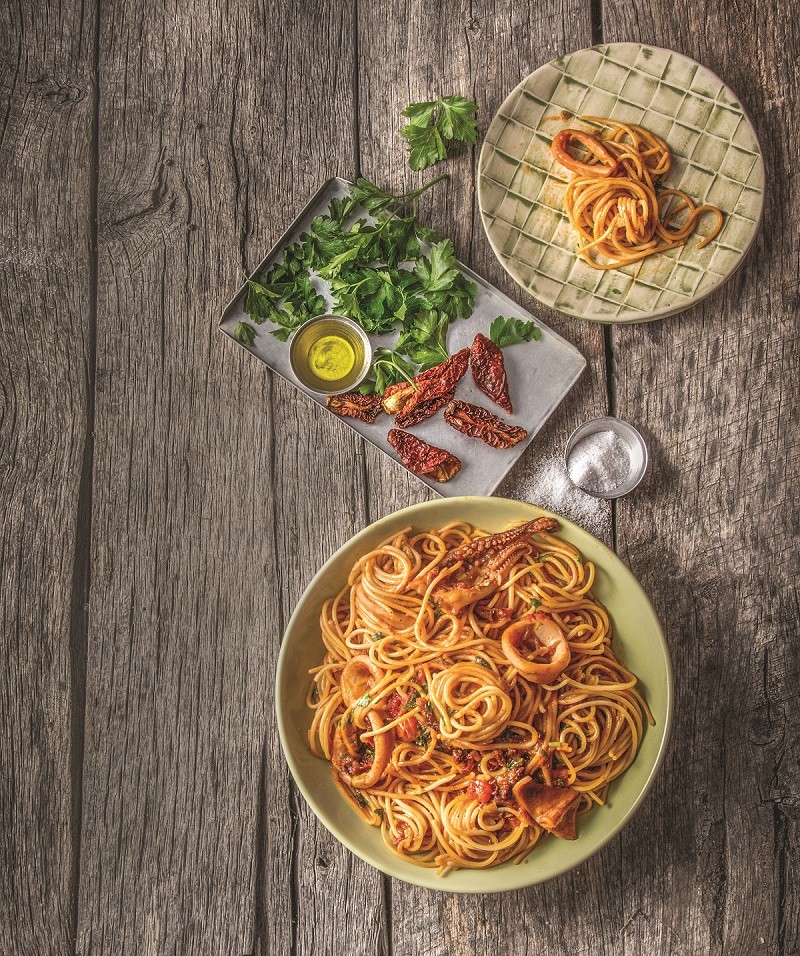 Καλαμαρομακαρονάδα με λιαστές ντομάτες και μουστάρδα. Μια διαφορετική μακαρονάδα με καλαμάρια που θα απογειώσει το καθημερινό σας τραπέζι