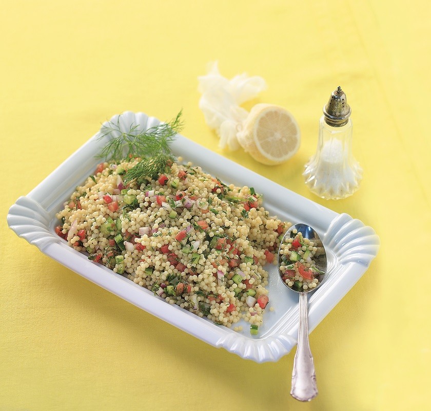Για σαλάτα, σας προτείνουμε ένα δροσερό πιάτο: Μια σαλάτα με κουσκουσάκι και λαχανικά, με αγγούρι, ντομάτα, φρέσκο σκόρδο και πολλά μυρωδικά.