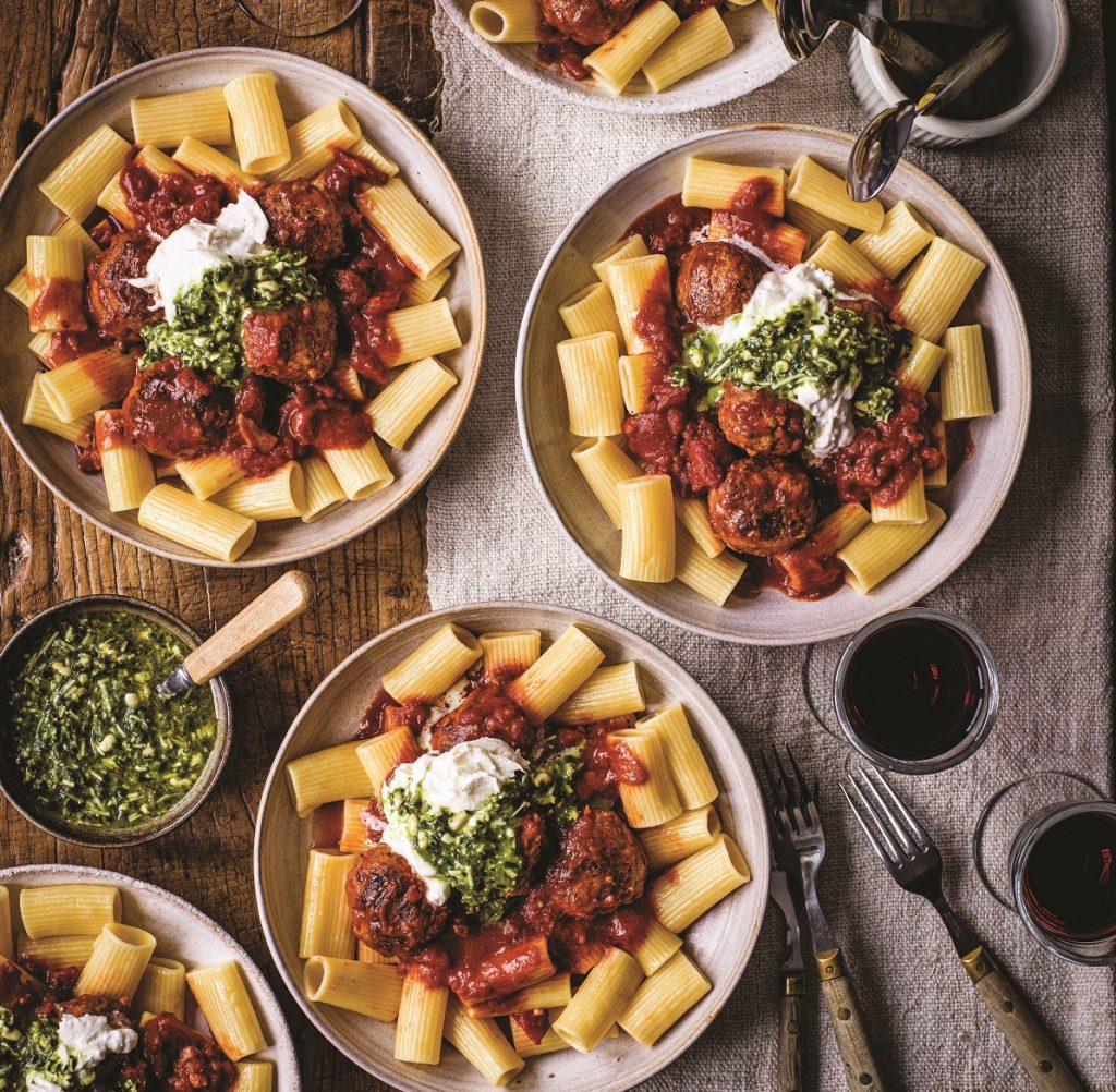 Κοκκινιστά κεφτεδάκια με ριγκατόνι, πέστο και μοτσαρέλα