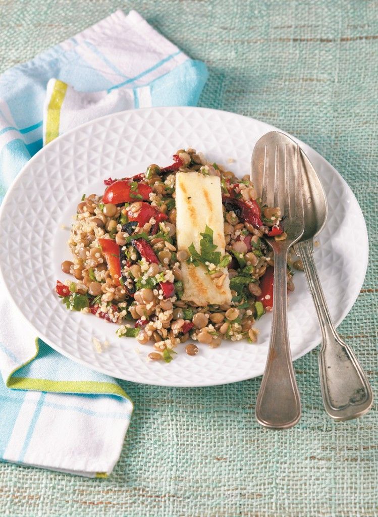 Σαλάτα με φακές, κινόα, κόκκινες πιπεριές και βινεγκρέτ μήλου. Θρεπτική σαλάτα, τόσο χορταστική που άνετα γίνεται και ένα ελαφρύ γεύμα.