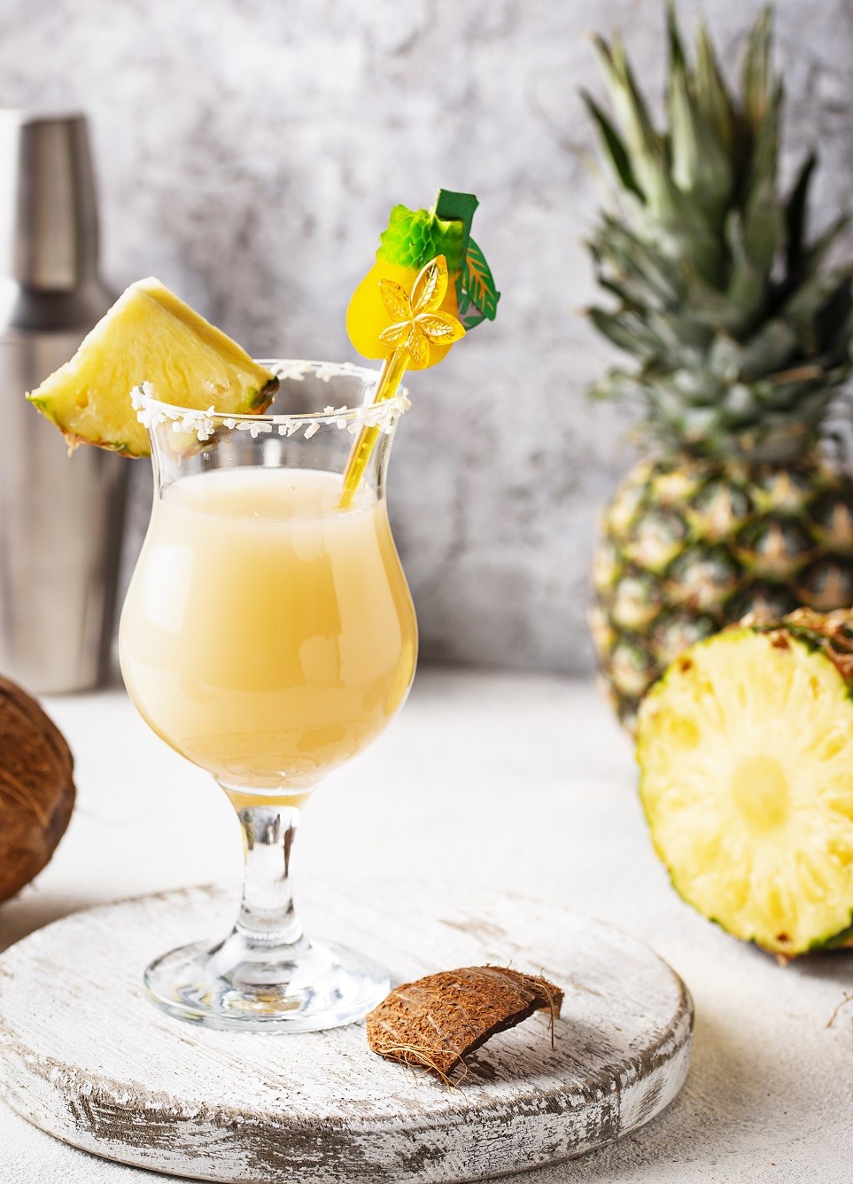 Για αυτό το κοκτέιλ των 3 συστατικών θα χρειαστούμε: 60 ml ρούμι, 60 ml φρέσκο χυμό ανανά και 45 ml κρέμα καρύδας. Χτυπάμε όλα τα υλικά με πάγο για 20 δευτερόλεπτα και προσθέτουμε λίγο Angostura bitters και χυμό από λάιμ. Διακοσμούμε με ανανά και με μια χάρτινη ομπρέλα. (Μπορούμε να αφαιρέσουμε το ρούμι, αν κάποιος δεν πίνει αλκοόλ, το  αποτέλεσμα θα είναι εξίσου γευστικό).