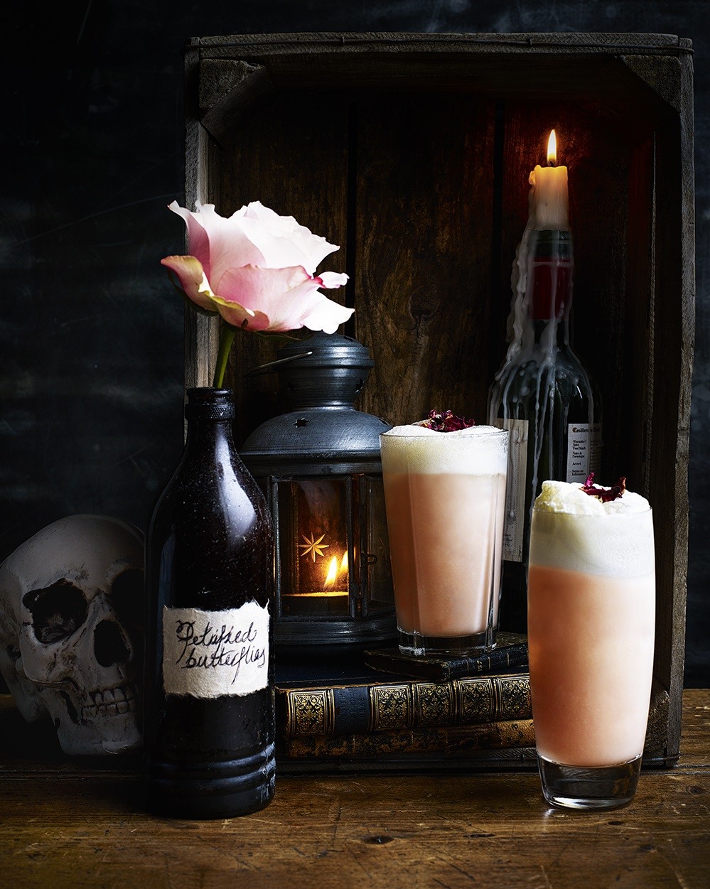 Έπειτα, βάζουμε όλα τα υλικά εκτός από τη σόδα και τα ροδοπέταλα σε ένα σέικερ για κοκτέιλ χωρίς πάγο και χτυπάμε δυνατά. Προσθέτουμε πάγο στο σέικερ και χτυπάμε ξανά, πολύ δυνατά, για λίγα λεπτά. Σουρώνουμε σε ένα παγωμένο ποτήρι και ρίχνουμε από πάνω τη σόδα. Γαρνίρουμε προσεκτικά με λίγα ροδοπέταλα.