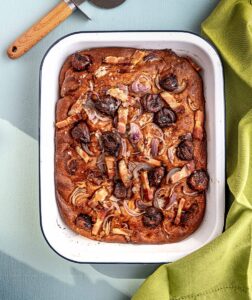 Το δημιουργικό χέρι του Γκίκα Ξενάκη προσθέτει κάστανα και μπέικον στη γενοβέζικη συνταγή της φοκάτσα με κρεμμύδια, η οποία αποκτά έτσι μεγαλύτερη γευστική ένταση και βάθος.