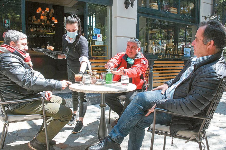 Στο καφέ-εστιατόριο «I Frati» στην Κηφισιά, ιδιοκτήτες και προσωπικό προβάρουν την επόμενη μέρα ξανά και ξανά. Βγάζουν τη μεζούρα, μετρούν την απόσταση που θα χωρίζει το ένα τραπέζι από το άλλο, σπαζοκεφαλιάζουν στις αριθμητικές πράξεις για να υπολογίζουν τη ζημιά, διακοσμούν τα τραπέζια και με… αντισηπτικά.