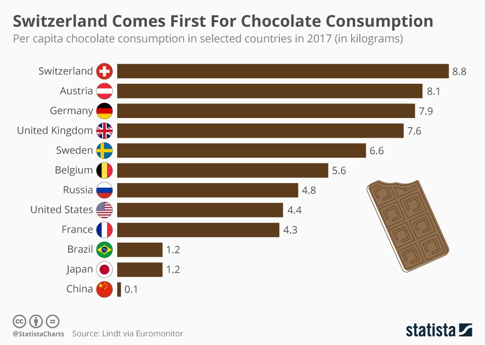 Αξίζει να επισημάνουμε ότι στην Ελβετία το κάθε άτομο καταναλώνει περί τα 8,8 κιλά το χρόνο – νούμερο που δικαιολογείται αν αναλογιστεί κανείς ότι η χώρα είναι γνωστή για την εξαιρετική βιομηχανία σοκολάτας. Ακολουθούν η Αυστρία και η Γερμανία, με 8,1 και 7,9 κιλά αντίστοιχα. Την «σοκολατένια» πεντάδα ολοκληρώνουν το Ηνωμένο Βασίλειο και η Σουηδία. Τέλος, στην 12η θέση βρίσκεται η Κίνα.
