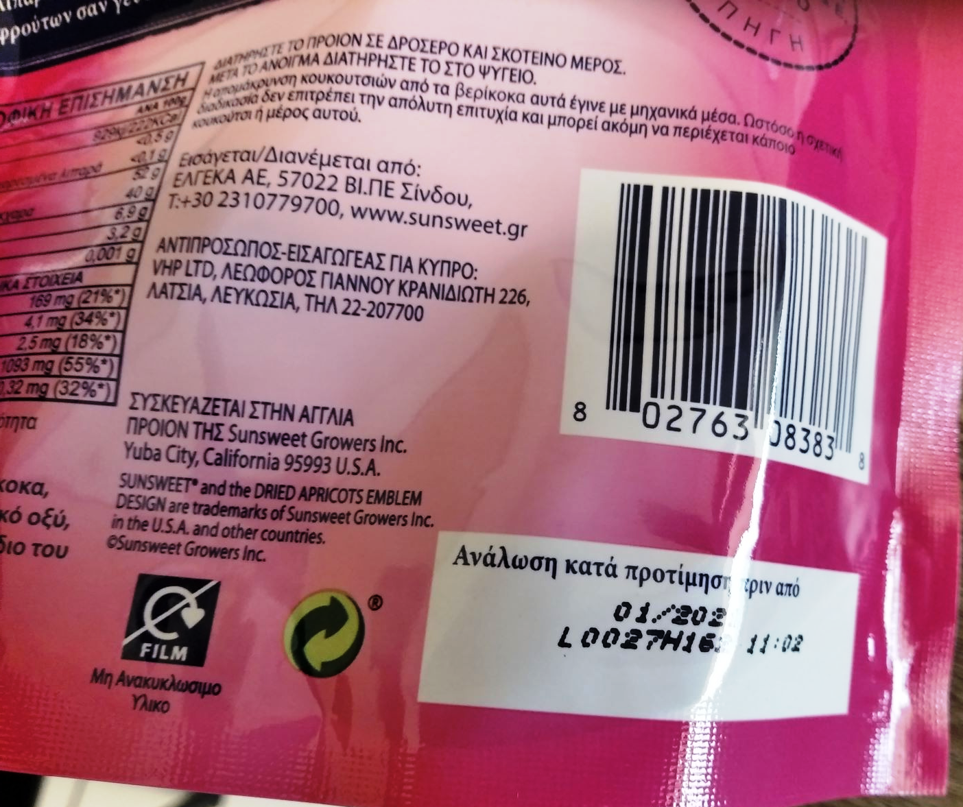 Ο ΕΦΕΤ και ειδικότερα η Περιφερειακή Διεύθυνση Αττικής, κατά τη διενέργεια ελέγχων στο πλαίσιο του επισήμου ελέγχου έτους 2020 για την παρακολούθηση των επιπέδων των προσθέτων τροφίμων σε τρόφιμα, προέβη σε δειγματοληψία του τροφίμου με την εμπορική ονομασία «SUNSWEET» , «Αποξηραμένα Βερίκοκα χωρίς κουκούτσι», σε συσκευασία των 175 γραμμαρίων, με στοιχεία: L0027Η162, ανάλωση κατά προτίμηση 01/2021. Εισαγωγέας/Διανομέας: ΕΛΓΕΚΑ Α.Ε.