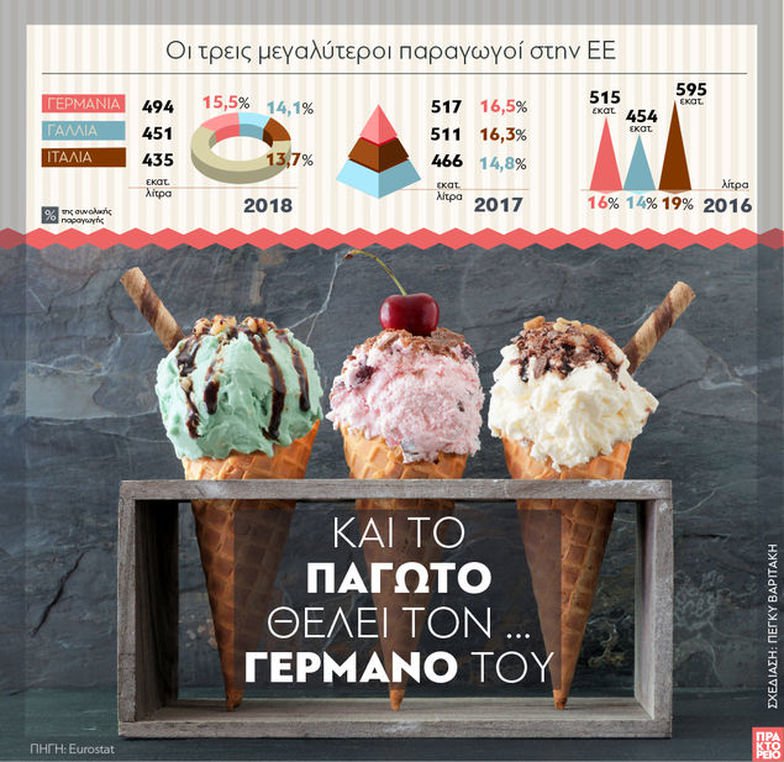 Τα παραπάνω στοιχεία, που προκύπτουν από τη Eurostat για τους μεγαλύτερους παραγωγούς παγωτού στην Ε.Ε., αποτύπωσε και σε γράφημα το ΑΠΕ – ΜΠΕ, σχολιάζοντας ότι «και το παγωτό θέλει τον… Γερμανό του».