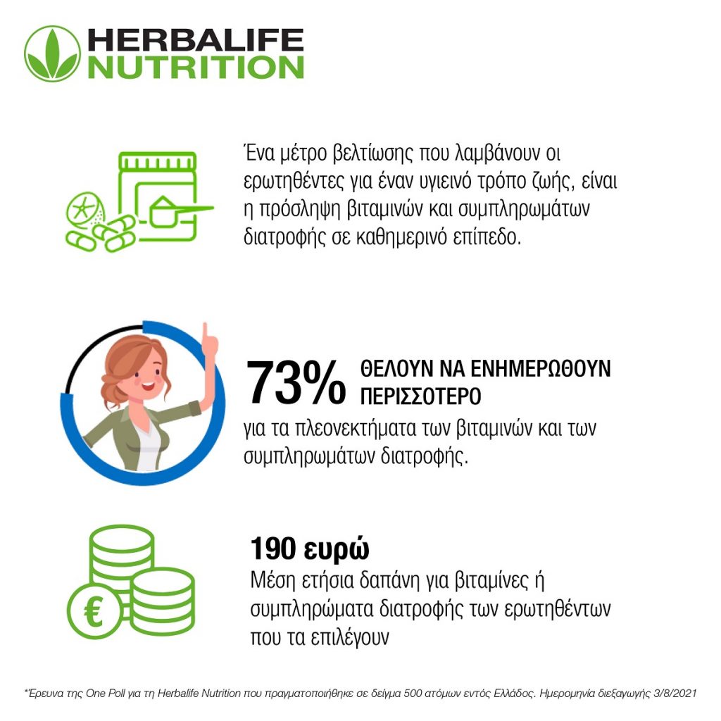 Τέλος, ο Γιώργος Μουλίνος, M.Sc. και Ph.d. Φυσιολογίας της Άθλησης και της Διατροφής, Post Doc Αθλιατρικής και μέλος της Συμβουλευτικής Επιτροπής Διατροφής της Herbalife Nutrition παγκοσμίως, προσθέτει: «Είτε πρόκειται για άσκηση, είτε για υγιεινή διατροφή είτε για λήψη βιταμινών και συμπληρωμάτων διατροφής, για πολλούς, η αλλαγή της καθημερινότητας λόγω των συνθηκών που επικρατούν σε παγκόσμιο επίπεδο, οδήγησε σε έναν πιο υγιεινό τρόπο ζωής. Οι βιταμίνες και τα συμπληρώματα διατροφής όχι μόνο μπορούν να μειώσουν τις διατροφικές ελλείψεις, αλλά μπορούν να ενισχύσουν και την ποσότητα των βασικών θρεπτικών συστατικών που χρειάζεται το σώμα μας για να υποστηρίξει την ευεξία μας καθημερινά».