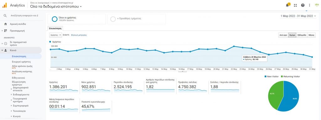 Και αυτός ο μήνας που πέρασε, ο Μάρτιος του 2022, έκλεισε με πολύ ενεργή τη δική σας παρουσία στο Olivemagazine.gr. Όπως δείχνουν τα στατιστικά για τον πρώτο μήνα της άνοιξης, οι λόγοι που μας επισκέπτεστε πολλοί: για συνταγές γλυκές και αλμυρές, για χρηστικά θέματα και συμβουλές, για νέα της γαστρονομικής σκηνής, για τις ανθρώπινες ιστορίες πίσω από κάθε εταιρεία παραγωγής ελληνικών προϊόντων, για τις συνεντεύξεις μας με μάγειρες και σεφ, για θέματα διατροφικά, για νέα της γαστρονομικής σκηνής στη χώρα μας, για ταξίδια και διευθύνσεις στην Αθήνα και αλλού.