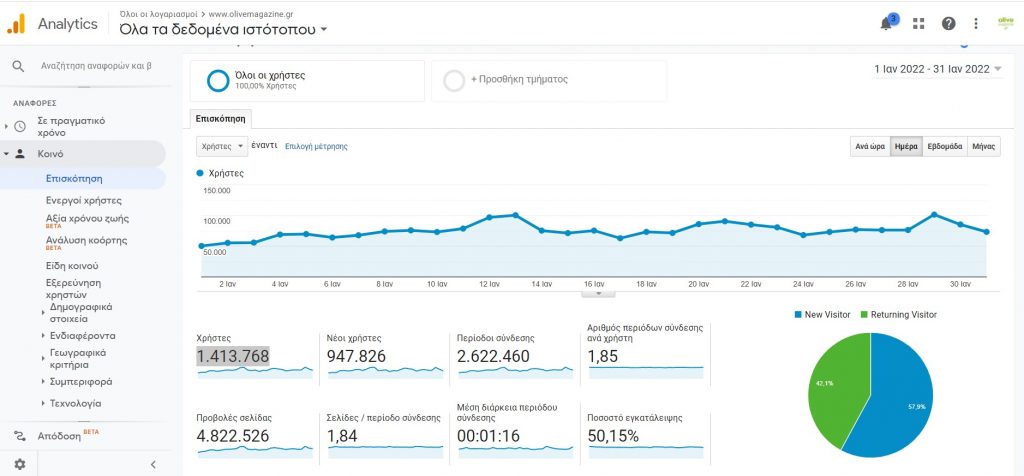 Σύμφωνα με τα επίσημα στοιχεία, λοιπόν, όπως αυτά καταγράφονται από την Google Analytics για τον Ιανουριο 2022, 1.413.768 μοναδικοί χρήστες επέλεξαν το olivemagazine.gr για όσα γαστρονομικά θέματα τους ενδιαφέρουν.