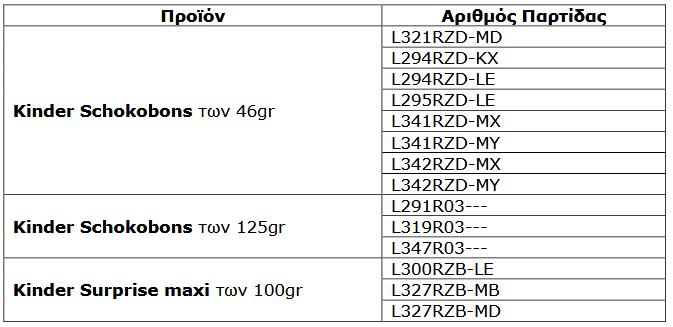 Πιο συγκεκριμένα, ο ΕΦΕΤ ενημερώθηκε από το Σύστημα Έγκαιρης Προειδοποίησης για τα Τρόφιμα και τις Ζωοτροφές (RASFF), σχετικά με την προληπτική ανάκληση συγκεκριμένων παρτίδων των προϊόντων Kinder Schokobons των 46 gr & 125 gr και Kinder Surprise maxi των 100 gr, λόγω πιθανής παρουσίας σαλμονέλας.
