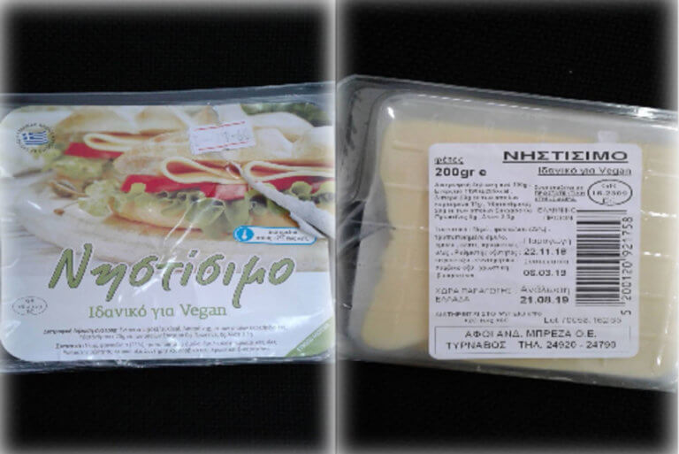 Πρόκειται για το προϊόν: «Νηστίσιμο, ιδανικό για vegan», Ελληνικής Προέλευσης σε συσκευασία προστατευμένης ατμόσφαιρας των 200g, κομμένο σε φέτες, με κωδικό παραγωγής Lot: 70058.162.65, ημερομηνία παραγωγής: 22/11/2018, ημερομηνία συσκευασίας: 06/03/2019 και ημερομηνία ανάλωσης: 21/08/2019, το οποίο διακινείται από την εταιρεία ΑΦΟΙ ΑΝΔ. ΜΠΡΕΖΑ Ο.Ε. – ΤΥΡΝΑΒΟΣ.
