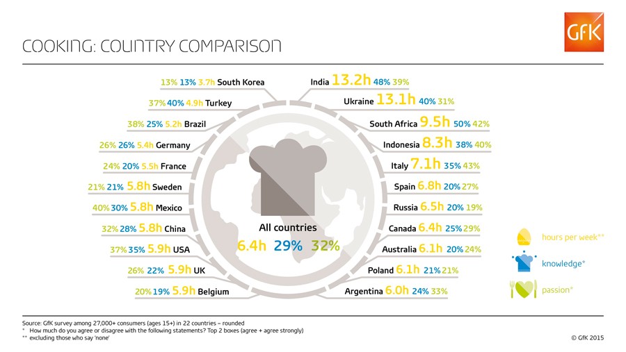 Στην έρευνα συμμετείχαν 27.000 άτομα ηλικιών από 15 έως 60+ από 22 χώρες από τους οποίους οι ερευνητές άντλησαν πληροφορίες σχετικά με τις μαγειρικές τους συνήθειες και τις ώρες που περνούν στην κουζίνα του σπιτιού τους σε εβδομαδιαία βάση. Πρώτοι στη λίστα έρχονται οι Ινδοί που μαγειρεύουν στο σπίτι 13.2 ώρες, ακολουθούν οι Ουκρανοί με 13.1 και τρίτοι οι κάτοικοι της Νότιας Αφρικής με 9.5 ώρες. Τα αποτελέσματα έδειξαν ότι περισσότεροι από τους μισούς συμμετέχοντες διεθνώς μαγειρεύουν καθαρά για διασκέδαση τουλάχιστον μία φορά την εβδομάδα ενώ η Ιταλία και η Νότια Αφρική είναι οι πιο «παθιασμένοι» με τη μαγειρική. Στην εν λόγω έρευνα δεν φαίνεται να έχει συμμετάσχει η Ελλάδα ωστόσο, αν αυτό συνέβαινε, σε ποια θέση πιστεύετε ότι θα βρισκόμασταν;