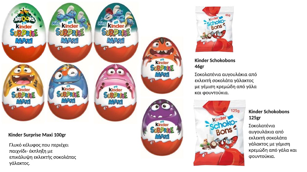 Συγκεκριμένα, όπως επισημαίνεται: «Με άμεση ισχύ, ανακαλείται όλη η παραγωγή των προϊόντων Kinder Surprise Maxi 100g και Kinder Schokobons που παρήχθησαν στην μονάδα της Αρλόν (ανεξαρτήτως αριθμού παρτίδας). Η Ferrero αναγνωρίζει ότι υπήρξαν εσωτερικές ανεπάρκειες που δημιούργησαν καθυστερήσεις στην έγκαιρη ανάκτηση και διαβίβαση πληροφοριών. Η μονάδα παραγωγής θα επαναλειτουργήσει μόλις πιστοποιηθεί από τις αρχές. Από αυτήν την ανάκληση επηρεάζονται μόνο τα προϊόντα Kinder που παράγονται στο εργοστάσιο της Αρλόν στο Βέλγιο. Στο εργοστάσιο αυτό της Αρλόν αναλογεί το 7% περίπου του συνολικού όγκου των προϊόντων Kinder που παράγονται παγκοσμίως ετήσια. Για την υποστήριξη των καταναλωτών σε σχέση με την διαδικασία ανάκλησης θα εφαρμοστούν μέτρα σε τοπικό επίπεδο. Αυτή είναι η μόνη και η ορθή απόφαση που πρέπει να ληφθεί προκειμένου να διασφαλισθεί το μέγιστο επίπεδο ασφάλειας των τροφίμων και να εξαλειφθεί ο κίνδυνος περαιτέρω μόλυνσης».