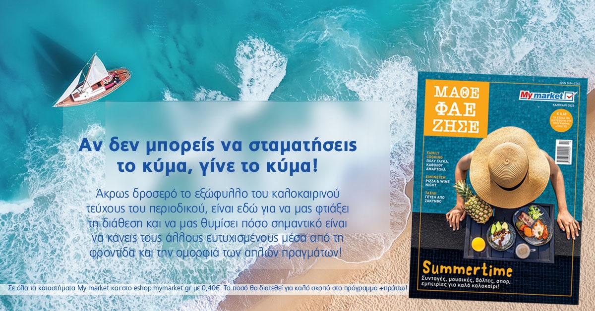 Κάτι ανάλογο μου συνέβη πριν από λίγες ημέρες όταν επισκέφτηκα το My market καθώς περίμενα τη σειρά μου στο ταμείο. Χάζευα τριγύρω και το μάτι μου έπεσε στο νέο τεύχος «ΜΑΘΕ ΦΑΕ ΖΗΣΕ» που το εξώφυλλό του μου τράβηξε αμέσως την προσοχή γιατί μου έδωσε την αίσθηση ότι πρόκειται να κάνω την πιο δροσιστική βουτιά του καλοκαιριού! Πραγματικά, όσο περίμενα ξεφυλλίζοντας το περιοδικό, διαπίστωσα ότι και αυτό το τεύχος – όπως και όλα τα προηγούμενα – έχει πλούσιο περιεχόμενο για θέματα άκρως ενδιαφέροντα, όπως διατροφή, ταξίδια, εμπειρίες, συνταγές και πολλά άλλα.