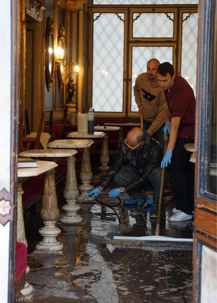 Σε άλλες φωτογραφίες που έχουν δημοσιευτεί αυτές τις μέρες, βλέπουμε καταστηματάρχες να προσπαθούν με κουβάδες, σκούπες και σφουγγαρίστρες να αδειάσουν τα νερά, ώστε να μπορούν να εξυπηρετήσουν τους χιλιάδες τουρίστες που συνεχίζουν να κάνουν τις βόλτες τους στους δρόμους, που περισσότερο κανάλια θυμίζουν.