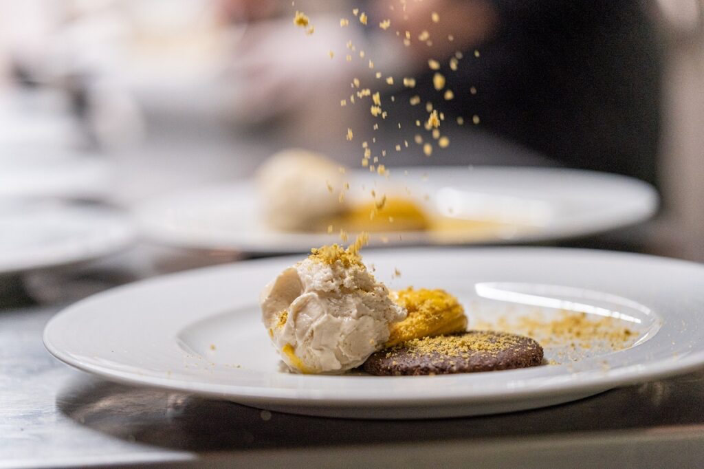 • Mousse γλυκοκολοκύθας με μαλακό μπισκότο γιαουρτιού, παστέλι κολοκυθόσπορου, παγωτό βανίλια και σάλτσα καραμέλα δεντρολίβανο