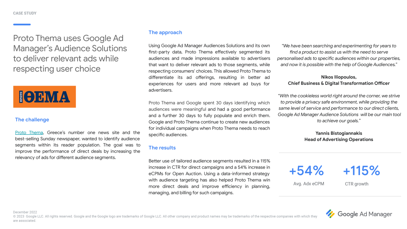 Γράφει χαρακτηριστικά στην ιστοσελίδα της: «Το Proto Thema, το κορυφαίο ειδησεογραφικό site και η κυριακάτικη εφημερίδα με τις υψηλότερες πωλήσεις στην Ελλάδα, χρησιμοποίησε το Audience Solutions του Google Ad Manager και τα δικά του first-party data για την αποτελεσματική τμηματοποίηση του κοινού και τη βελτίωση των επιδόσεων των απευθείας συμφωνιών.