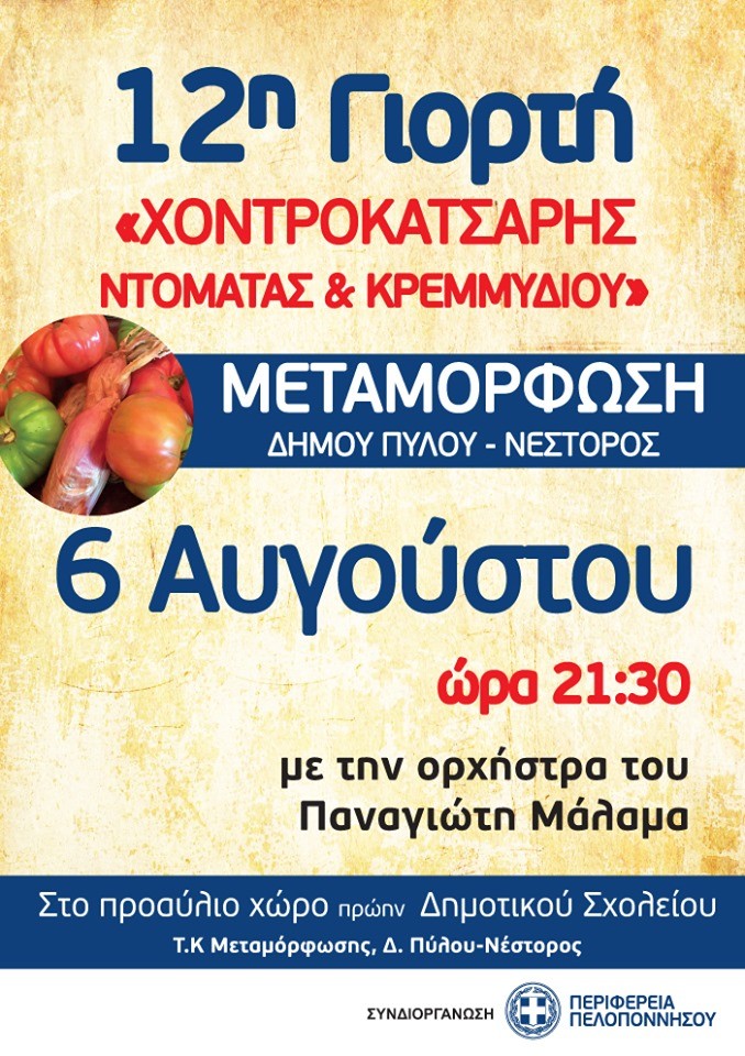 Ο Πολιτιστικός Σύλλογος Γυναικών της τοπικής κοινότητας Μεταμόρφωσης του Δήμου Πύλου Νέστορος “Η Εστία”, διοργανώνει την 12η γιορτή Χοντροκατσαρής ντομάτας και κρεμμυδιού, την Τρίτη 6 Αυγούστου στις 21:30 το βράδυ, στο χώρο του Δημοτικού σχολείου Μεταμόρφωσης.