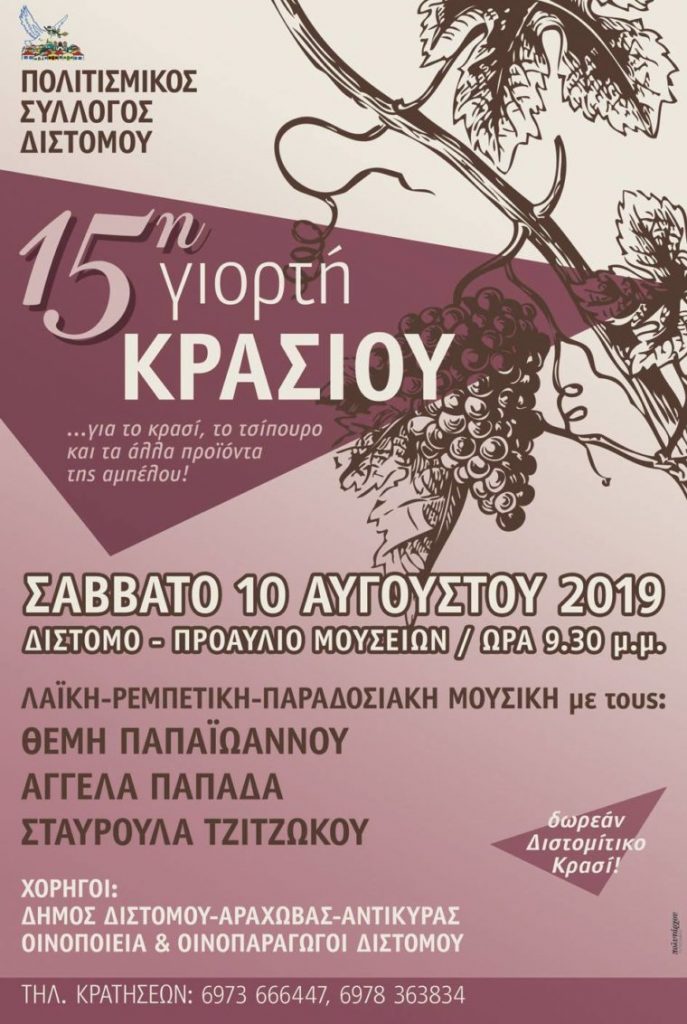 Το Σάββατο 10 Αυγούστου 2019 θα διεξαχθεί η 15η Γιορτή Κρασιού Διστόμου που διοργανώνει εδώ και χρόνια ο Πολιτισμικός Σύλλογος της περιοχής.