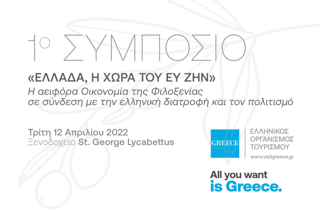 Πραγματοποιείται σήμερα το πρώτο συμπόσιο “Ελλάδα – Η χώρα του ευ ζην” με θέμα «Η Αειφόρα Οικονομία της Φιλοξενίας σε σύνδεση με την Ελληνική Διατροφή και Πολιτισμό», που διοργανώνει ο ΕΟΤ στο ξενοδοχείο St. George Lycabettus. Η εκδήλωση θα μεταδοθεί σε live streaming από το link: https://vimeo.com/event/2005547. Η μετάδοση θα ξεκινήσει στις 14:30.