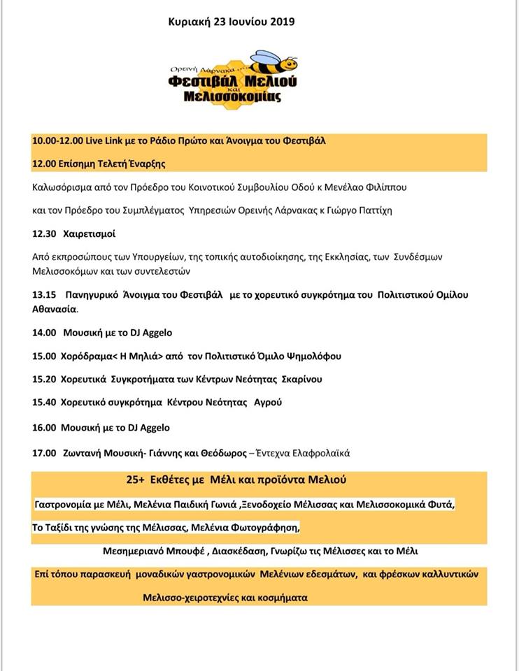 Τα Μελισσοχώρια της Ορεινής Λάρνακας φιλοξενούν για τρίτη φορά την Κυριακή 23 Ιουνίου 2019 (11 π.μ. – 8 μ.μ.), το φεστιβάλ Μελιού και Μελισσοκομίας ,στο χωριό της Οδού.