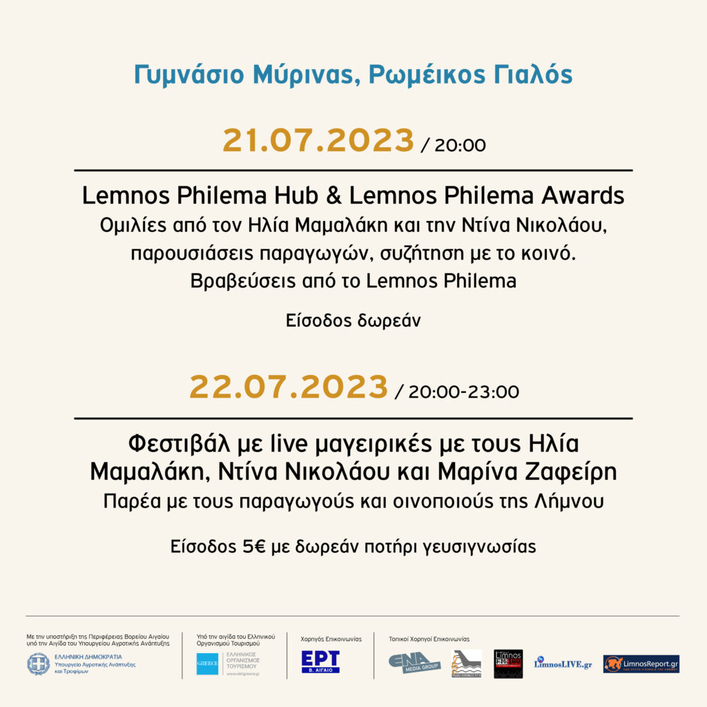 Το Limnos Philema θα λάβει χώρα στις 21 και 22 Ιουλίου, με τη συμμετοχή παραγωγών, οινοποιών, εστιατόρων αλλά και μελών του Συλλόγου Γαστρονομίας και Οίνου Λήμνου. Την πρώτη μέρα του Φεστιβάλ θα πραγματοποιηθεί η Ημερίδα και θα απονεμηθούν τα βραβεία για τη συμβολή στην ανάδειξη και διατήρηση του πολιτισμού, της γαστρονομίας και του οίνου της Λήμνου. Τη δεύτερη μέρα, παραγωγοί και οινοποιοί της Λήμνου θα παρουσιάζουν τα προϊόντα τους και θα συνομιλήσουν με το κοινό. Παράλληλα, θα υπάρξουν live cooking sessions, ζωντανές μαγειρικές από τον κ. Ηλία Μαμαλάκη, την Ντίνα Νικολάου και την Μαρίνα Ζαφείρη, όπου το κοινό θα έχει την ευκαιρία να δοκιμάσει τις δημιουργίες τους.