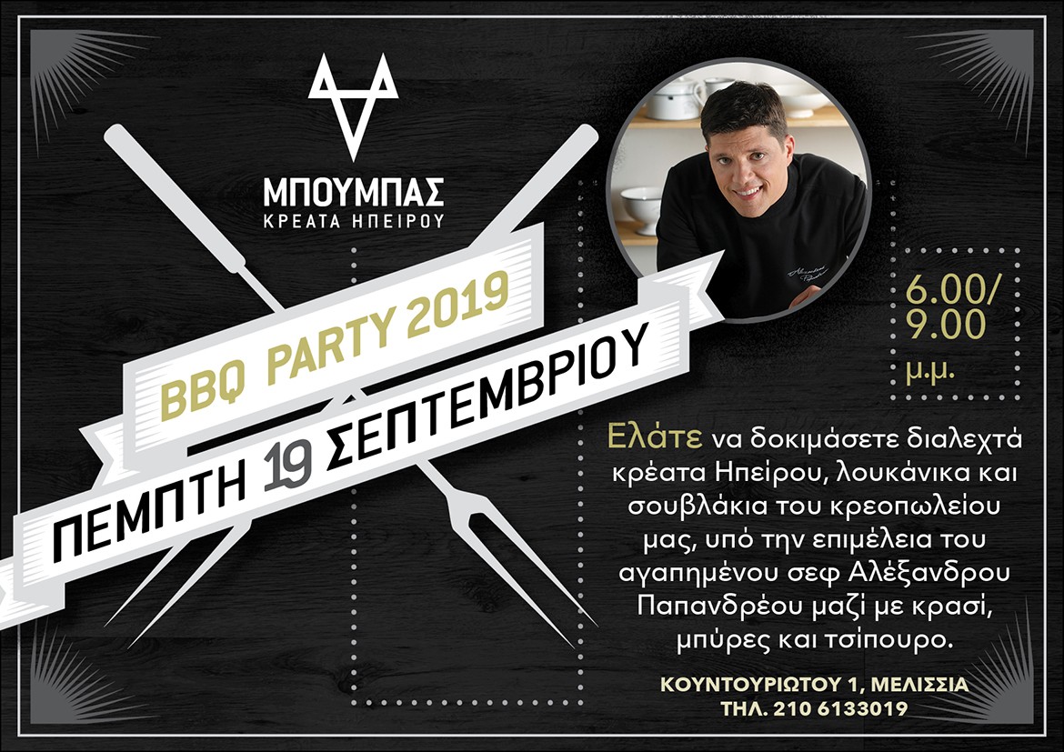 Την Πέμπτη 19 Σεπτεμβρίου, στο ηπειρώτικο κρεοπωλείο Μπούμπας στα Μελίσσια, ο σεφ Αλέξανδρος Παπανδρέου θα ετοιμάσει special νοστιμιές σε ένα νόστιμο BBQ πάρτι.