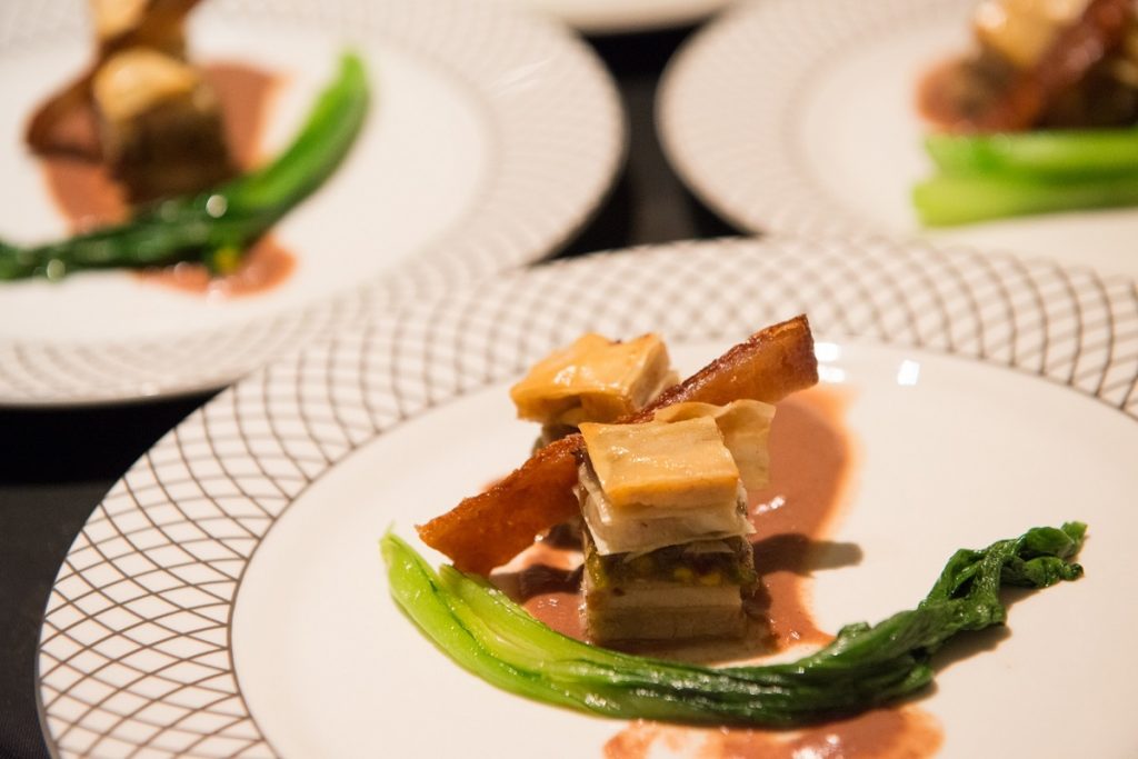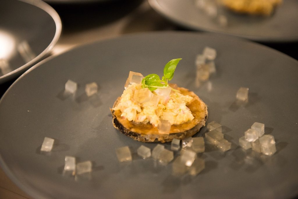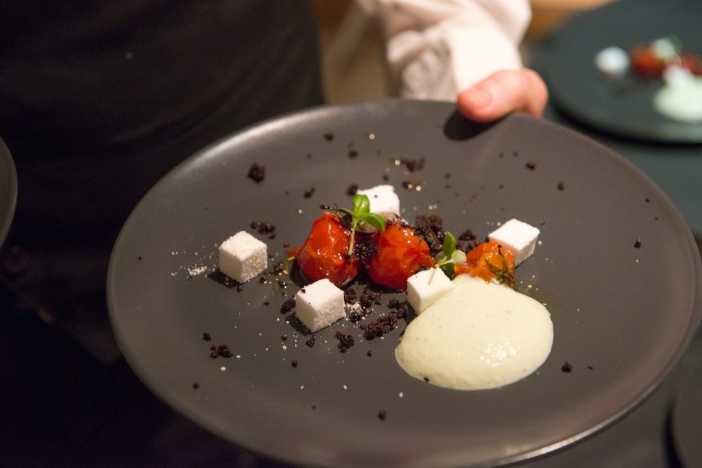Το δείπνο ξεκίνησε με ψάρι, Μαγιάτικο με σχινόπρασο πάνω σε τραγανή καπνιστή μελιτζάνα με ζελεδάκια τσίπουρου, ενώ συνέχισε με μια άλλου τύπου «Χωριάτικη» από ψητά ντοματίνια Σάμου με μους αγγουριού, marshmallows φέτας και πούδρα ελιάς και με μια επίσης διαφορετική -και αποδομημένη- «Χορτόπιτα», που αποτελούνταν από τραγανές πιτούλες ρότι, χόρτα, τζίντζερ και σος στρειδιών.
