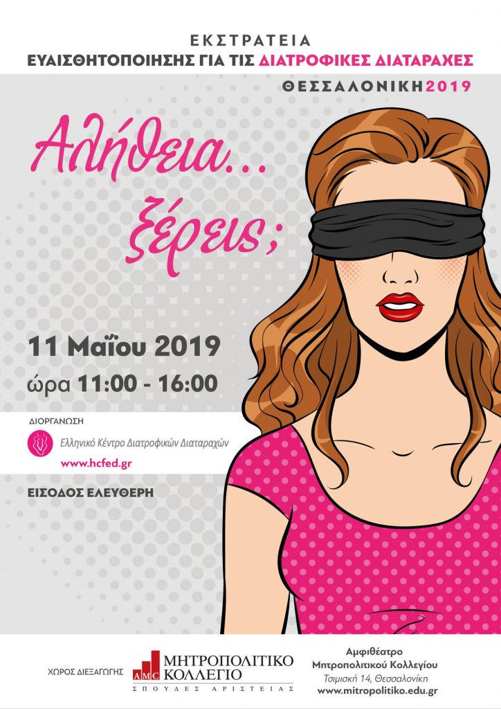 Δύο μήνες από την μεγάλη ενημερωτική ημερίδα που πραγματοποίησε το Ελληνικό Κέντρο Διατροφικών Διαταραχών στην Αθήνα, η Πρόεδρος του Κέντρου Δρ. Μαρία Τσιάκα και η ομάδα της ταξιδεύουν στη Θεσσαλονίκη. Στόχος τους, να ενημερώσουν όσο το δυνατόν περισσότερο κόσμο σχετικά με τις διατροφικές διαταραχές. Μια ασθένεια που ταλανίζει το 7-8% του ελληνικού πληθυσμού.