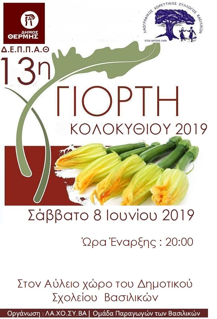Το Σάββατο 8 Ιουνίου και ώρα 20:00 μ.μ ο Λαογραφικός χορευτικός σύλλογος Βασιλικών διοργανώνει την 13η Γιορτή Κολοκυθιού στον αύλειο χώρο του Δημοτικού Σχολείου Βασιλικών.