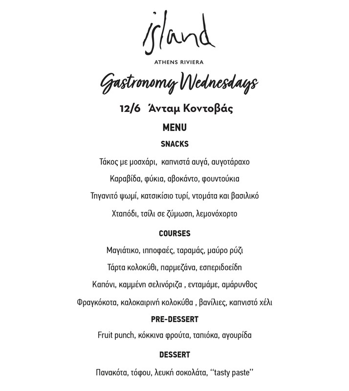 Την Τετάρτη 12 Ιουνίου, εν συνεχεία των Gastronomy Wednesdays, ο σεφ Άνταμ Κοντοβάς παίρνει τη σκυτάλη και μαγειρεύει στην κουζίνα του lsland.
