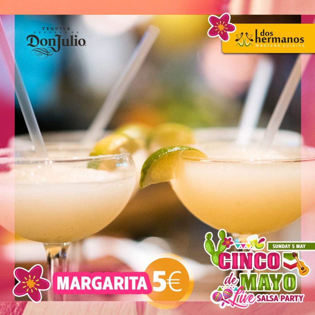 Πιες όσες Margaritas Don Julio αντέχεις στην ειδική τιμή των 5€/η μία και άσε τους χορευτές να σε οδηγήσουν σε ένα παραδοσιακό μεξικάνικο χορευτικό στο επετειακό live latin party. Εννοείται ότι δεν θα λείπει το απαραίτητο συστατικό κάθε μεξικάνικης γιορτής: οι φημισμένες λιχουδιές του Dos Hermanos που θα φέρουν την όρεξη στο τραπέζι σου.
