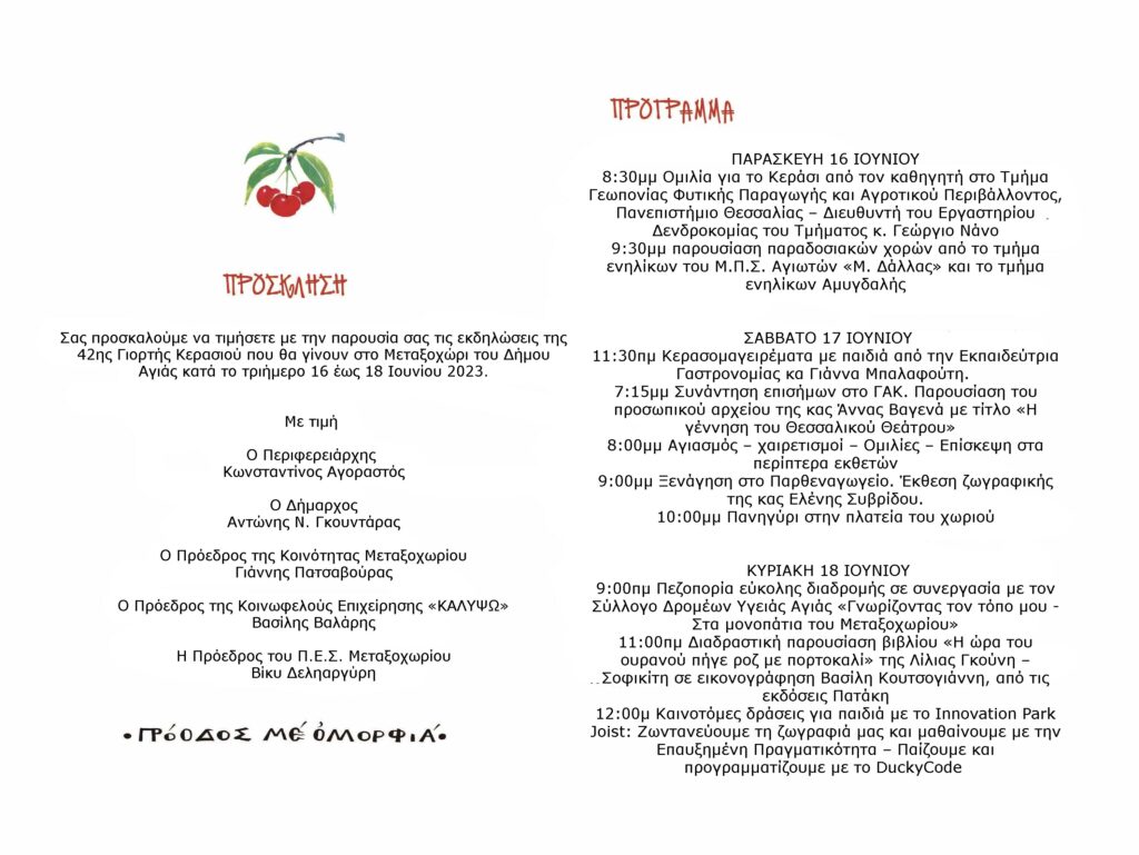 Σε ένα πανέμορφο και γραφικό χωριό, γεμάτο πράσινο, θα «τρέχει» όλο το διήμερο η παραδοσιακή γιορτή του αγαπημένου καλοκαιρινού καρπού. Θα υπάρχουν εκθέτες με διάφορα παραδοσιακά προιόντα ενώ θα πραγματοποιηθούν διάφορες ομιλίες και δράσεις για μικρούς και μεγάλους. Πρόκειται για τη 42η Γιορτή του Κερασιού, που θα λάβει χώρα το Σαββατοκύριακο 17 και 18 Ιουνίου, στο Μεταξοχώρι του του Δήμου Αγιάς στη Λάρισα.