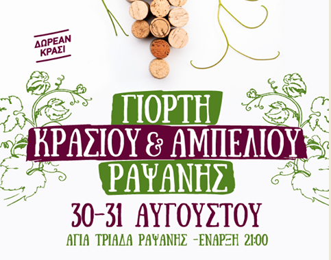 Η καθιερωμένη Γιορτή Κρασιού και Αμπελιού Ραψάνης θα πραγματοποιηθεί φέτος το διήμερο της 30 και 31 Αυγούστου, Παρασκευή και Σάββατο, στο χώρο της Αγίας Τριάδας στην είσοδο του χωριού, με ώρα έναρξης 9 το βράδυ.