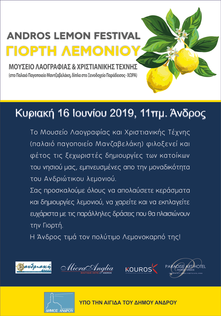 Το πανέμορφο νησί της Άνδρου θα μοσχομυρίσει εσπεριδοειδή την Κυριακή 16 Ιουνίου 2019, καθώς θα πραγματοποιηθεί υπό την αιγίδα του Δήμου Άνδρο για μία ακόμη χρονιά η Γιορτή Λεμονιού. Η εκδήλωση θα φιλοξενηθεί και φέτος στο Μουσείο Λαογραφίας και Χριστιανικής Τέχνης, στη Χώρα από τις 11πμ μέχρι τις 4μμ.