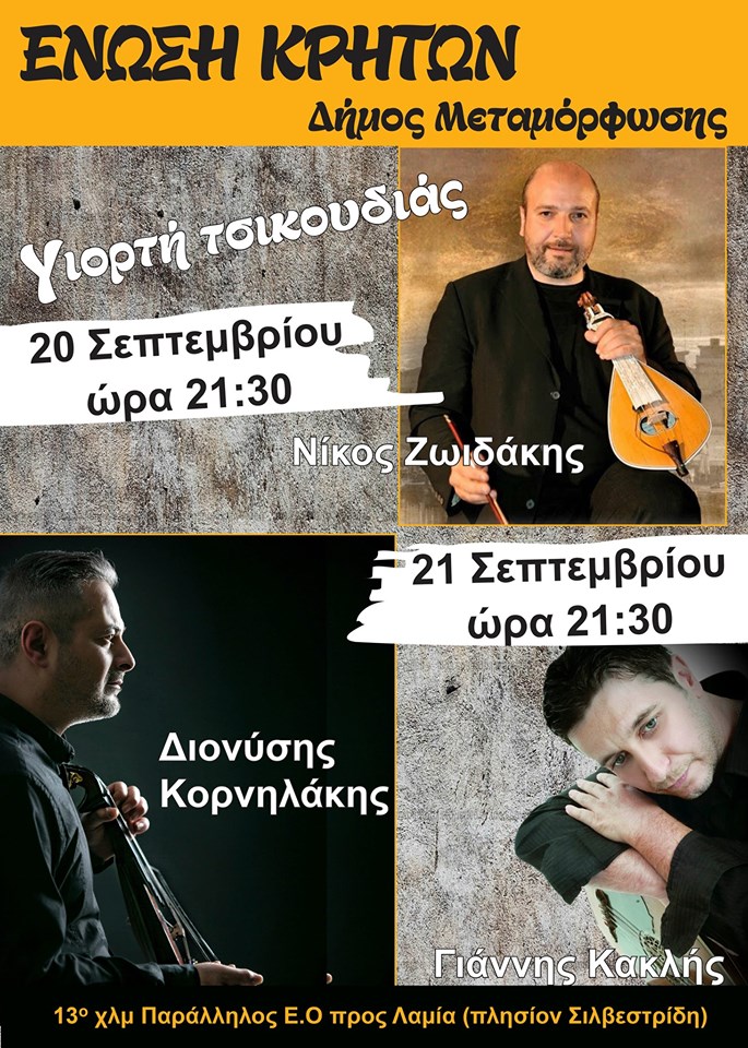 Η Ένωση Κρητών Μεταμόρφωσης διοργανώνει τη γιορτή τσικουδιάς την Παρασκευή 20 και το Σάββατο 21 Σεπτεμβρίου, στο παράλληλο της Εθνικής Οδού προς Λαμία, (13 ο χιλιόμετρο Λάμπρου Κατσώνη και Ερμού), δίπλα στο ΣΙΛΒΕΣΤΡΙΔΗ στη Μεταμόρφωση.
