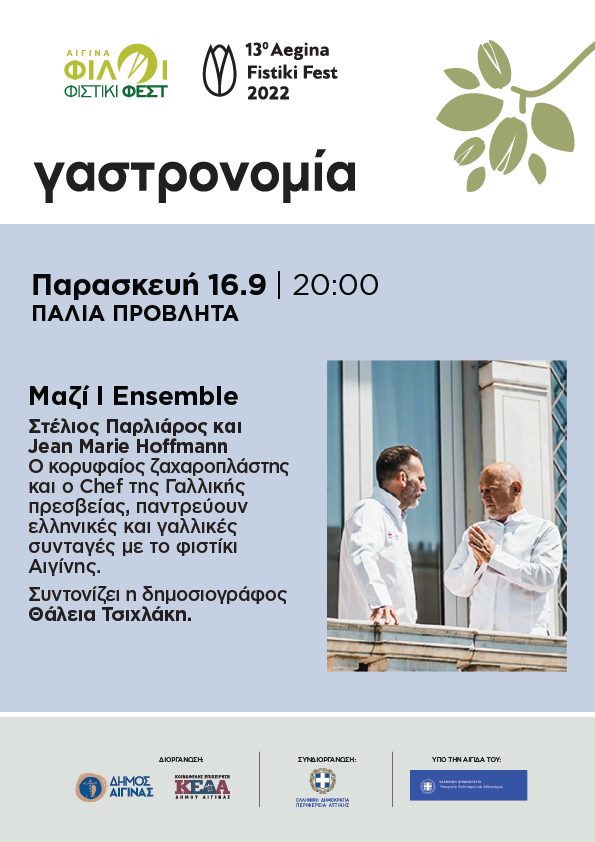 Πιο συγκεκριμένα, την Παρασκευή όσοι βρεθούν στην Αίγινα αύριο, 16/9, θα έχουν τη δυνατότητα να παρακολουθήσουν μια… γλυκιά συνάντηση στην Παλιά Προβλήτα. Ο διάσημος ζαχαροπλάστης Στέλιος Παρλιάρος και ο chef της γαλλικης Πρεσβείας Jean-Marie Hoffman παντρεύουν ελληνικές και γαλλικές συνταγές με το φιστίκι Αιγίνης. Συντονίζει η δημοσιογράφος Θάλεια Τσιχλάκη.