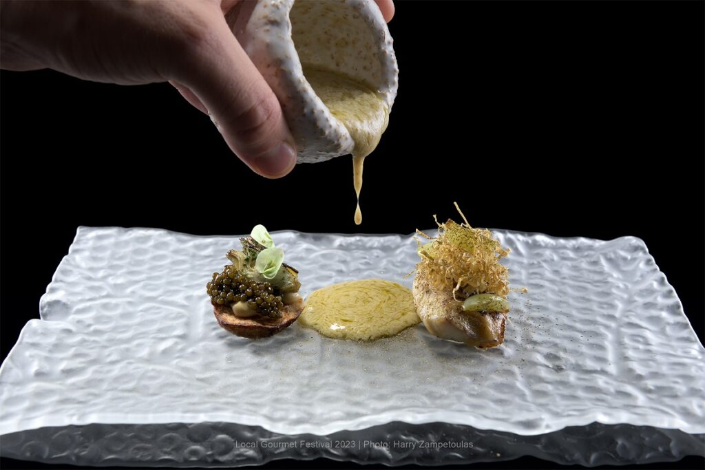Επιστροφή όμως στο Local Gourmet Festival, το οποίο είναι ένας γευστικός διάλογος, που αυτή την χρονιά είχε ακόμα μεγαλύτερο ενδιαφέρον, μιας και η ροδίτική κουζίνα μπλέχθηκε με κουζίνες του εξωτερικού και διαφορετικές μαγειρικές φιλοσοφίες. Τις πέντε ημέρες που κράτησε το φεστιβάλ, από την κουζίνα του εστιατορίου εκτός των δύο ξένων προαναφερθέντων, πέρασαν ο Γιώργος Παπαζαχαρίας από το διάστερο, αθηναϊκό εστιατόριο Delta, ο Γάλλος Jean- Charles Metayer, συνιδιοκτήτης του εστιατορίου Le Pavillon βραβευμένο με Michelin Guide’s Point Of View καθώς και ο Πάνος Δήμου, chef έρευνας και ανάπτυξης στο βραβευμένο με τρία αστέρια Michelin El Celler de Can Roca στη Χιρόνα της Ισπανίας.