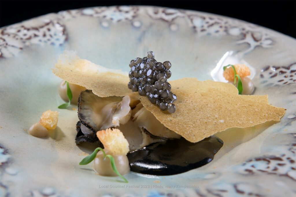 Ψητό στρείδι με χαβιάρι beluga και μελιτζάνα από τον σεφ Jean- Charles Metayer