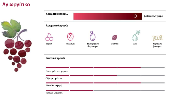 Σταφύλια με βαθύ μπλε, με μικρές σφαιρικές ρόγες και παχύ φλοιό δημιουργούν το Αγιωργίτικο, την πιο διαδεδομένη ερυθρή ποικιλία του ελληνικού αμπελώνα. Αμπελουργοί και οινοποιοί εκθειάζουν τα ποιοτικά χαρακτηριστικά και τον πολυδυναμικό χαρακτήρα του. Και οι οινόφιλοι, του δίνουν αβίαστα ψήφο εμπιστοσύνης εστιάζοντας στην καθαρότητα και την αρμονία των χαρακτηριστικών των κρασιών του, τόσο στη μύτη όσο και στο στόμα.