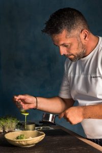 * Ριζότο Ορτύκι (Κυριακή Φωτοπούλου) – Φιστίκι, πανακότα κρεμμύδι, αβγό ορτυκιού / Κρασί: Νυχτέρι Χατζηδάκη, ΠΟΠ Σαντορίνη, 2015, Ασύρτικο 100%