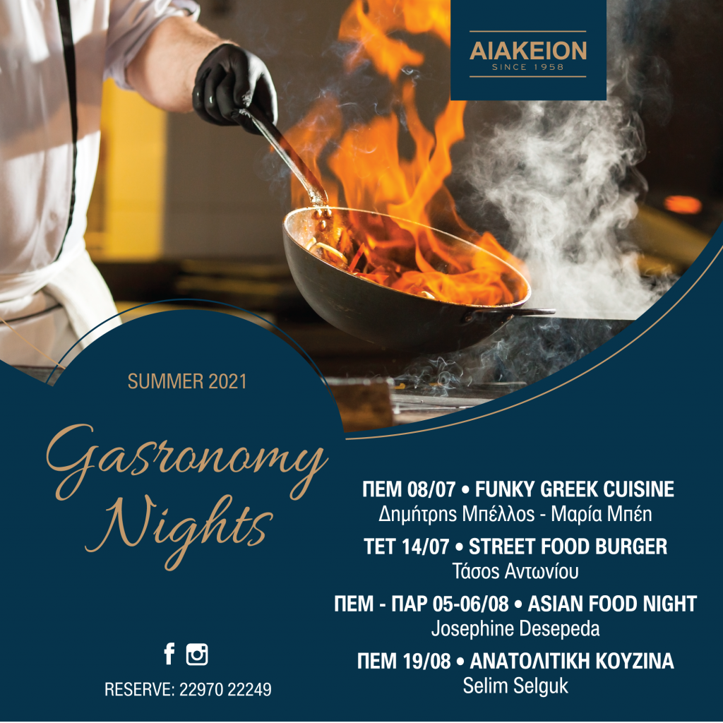 Η συνέχεια των γαστρονομικών εκδηλώσεων Aiakeion Gastronomy Nights θα συνεχιστεί με τη Josephine Desepeda με το «Asian Food Night» την Πέμπτη 5 και την Παρασκευή 6 Αυγούστου και με τον Selim Selguk με την «Ανατολίτικη Κουζίνα» την Πέμπτη 19 Αυγούστου.